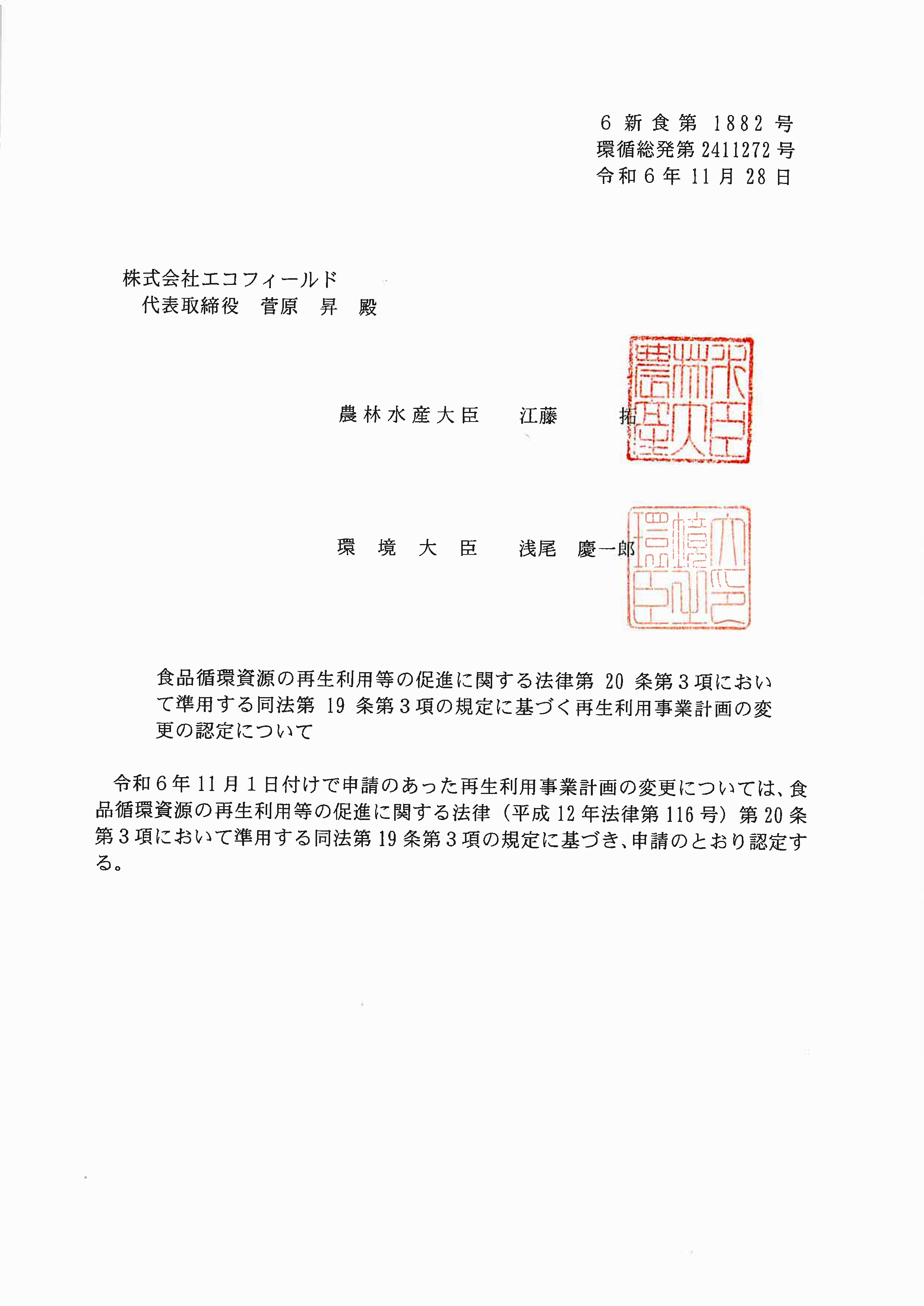 ![]() 再生利用事業計画 認定書 (クリックでPDFを別窓表示) |